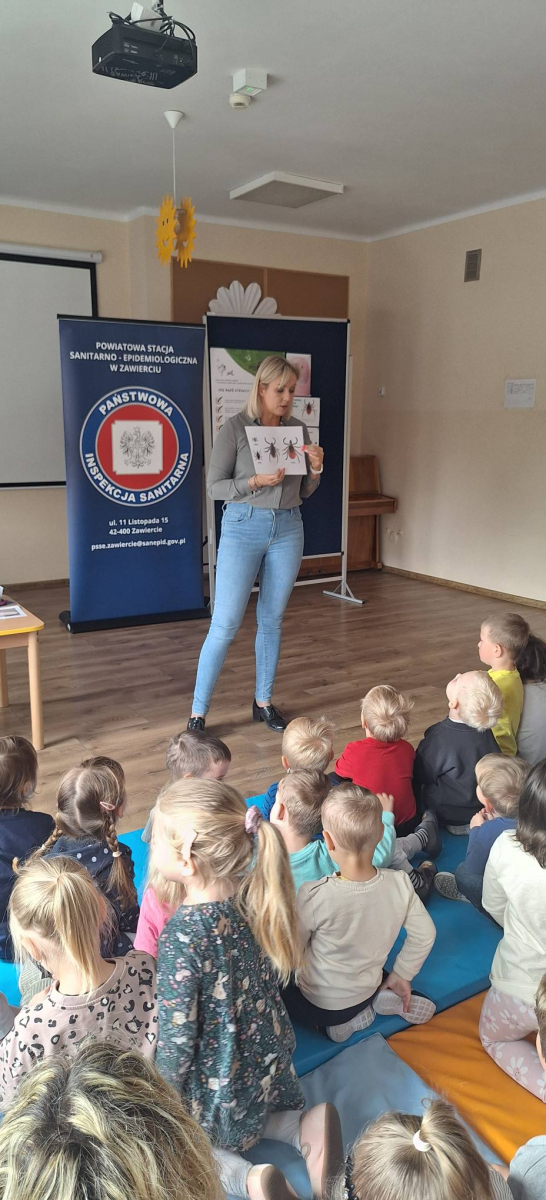 Dzięki pogadance, pokazom i ilustracjom maluchy zrozumiały, jak ważna jest ochrona przed ukąszeniami oraz dbanie o zdrowie już od najmłodszych lat. Dziękujemy Pani Katarzynie za wartościowe i inspirujące spotkanie!W ramach programu „Klub Zdrowego Przedszkolaka” nasze przedszkolaki wzięły udział w bardzo ważnym spotkaniu z Panią Katarzyną Domagałą, pracownikiem Powiatowej Stacji Sanitarno Epidemiologicznej w Zawierciu. Tematem zajęć była profilaktyka chorób odkleszczowych – niezwykle istotna kwestia, zwłaszcza w sezonie wiosenno-letnim. Dzieci w przystępny i ciekawy sposób dowiedziały się: